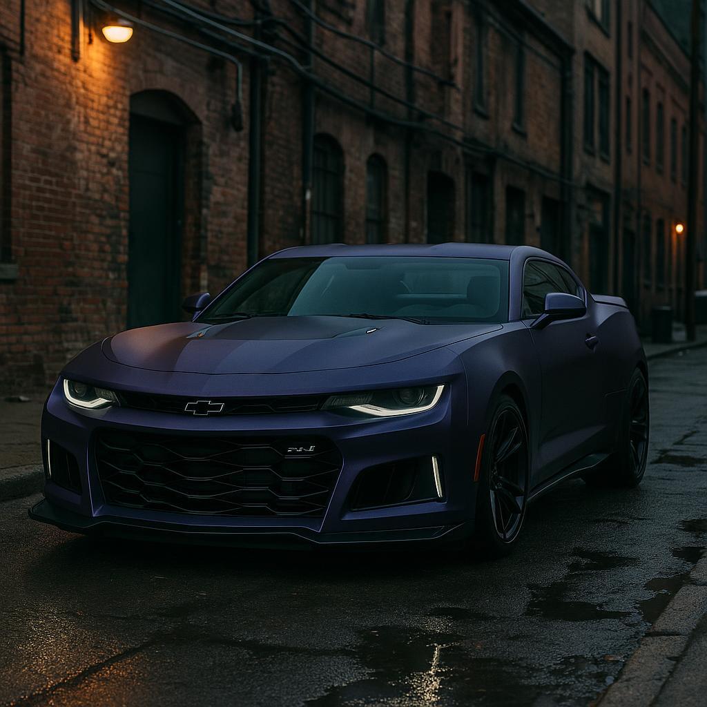 On vehicle surfaces, dominant color: Deep purple with cool blue undertones. Finish and sheen: Matte with a smooth, non-glossy surface.