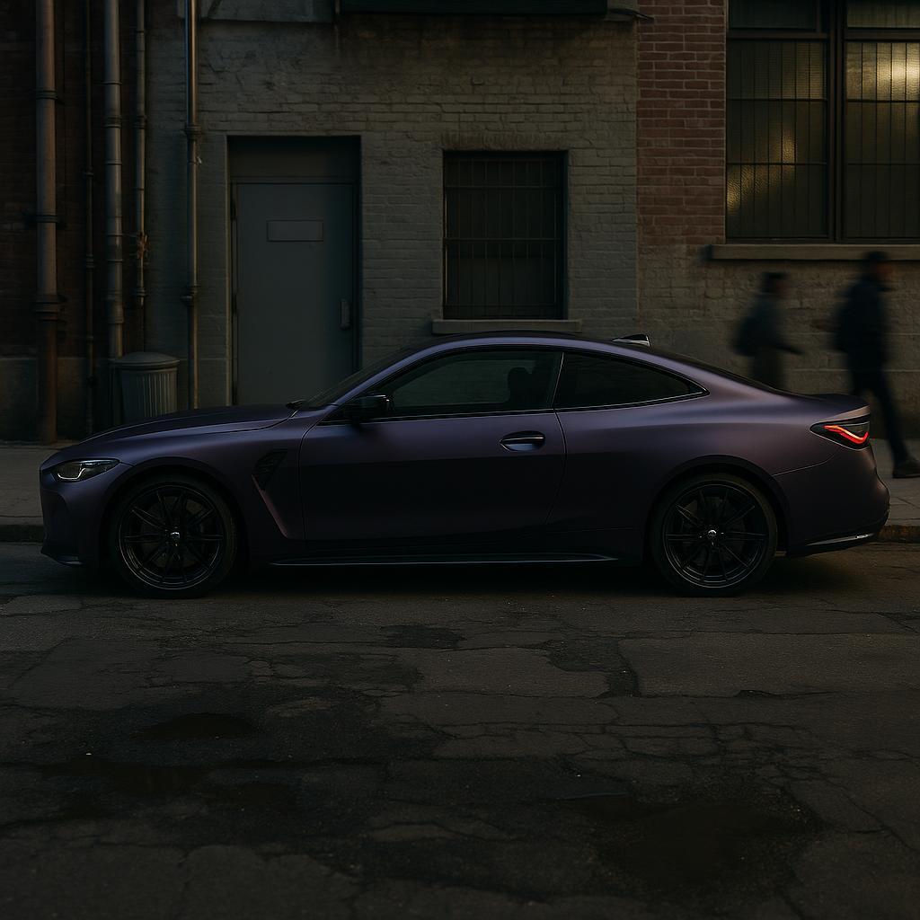 For car wrap applications where finish quality matters, it pairs visual character with dependable panel consistency. Across body lines, finish is matte with very low sheen, lacking glossiness. Texture appears smooth and uniform with no visible pattern or grain. Opaque with no transparency or translucency visible in the swatch. The result is a confident, premium visual finish that photographs well and performs in real-world driving contexts.
