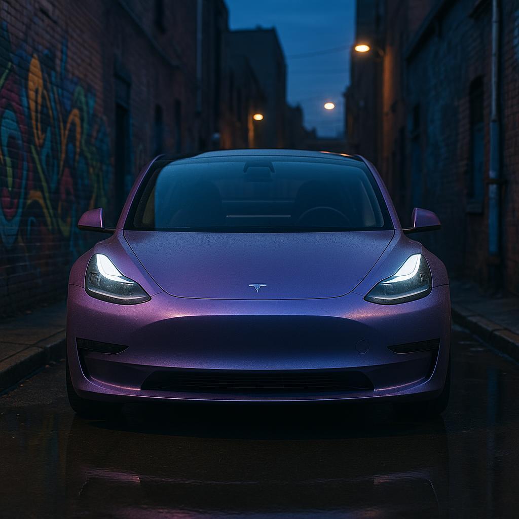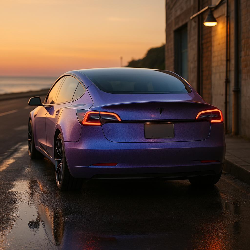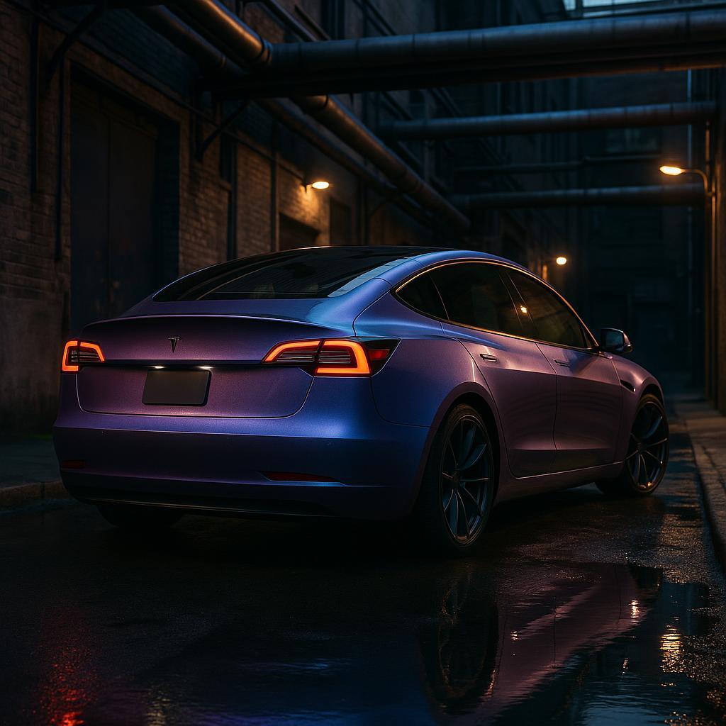 In day-to-night scenes, reflectivity changes under light, showing a color shift from violet to blue, with moderate reflectivity and subtle gradient effects under both hard and soft light. Texture appears finely granular or slightly speckled, creating a micro-pattern that enhances the pearlescent effect on a small scale. Opaque with no visible transparency, fully saturating the base color. This makes it a strong option for customers seeking a custom look with professional-grade presentation.