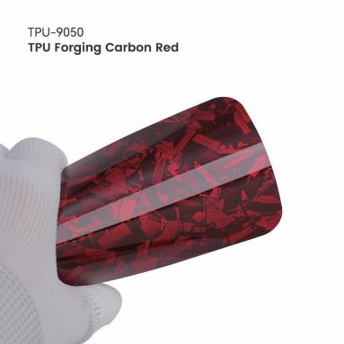 Forging Carbon Red (TPU-9050) brings a high-end TPU aesthetic tailored for modern vehicle styling projects. In practical use, finish and sheen: High-gloss, reflective surface with a smooth, polished appearance.