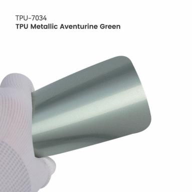 Metallic Aventurine Green (TPU-7034) brings a high-end TPU aesthetic tailored for modern vehicle styling projects. In practical use, finish is metallic with a smooth, high-gloss sheen.