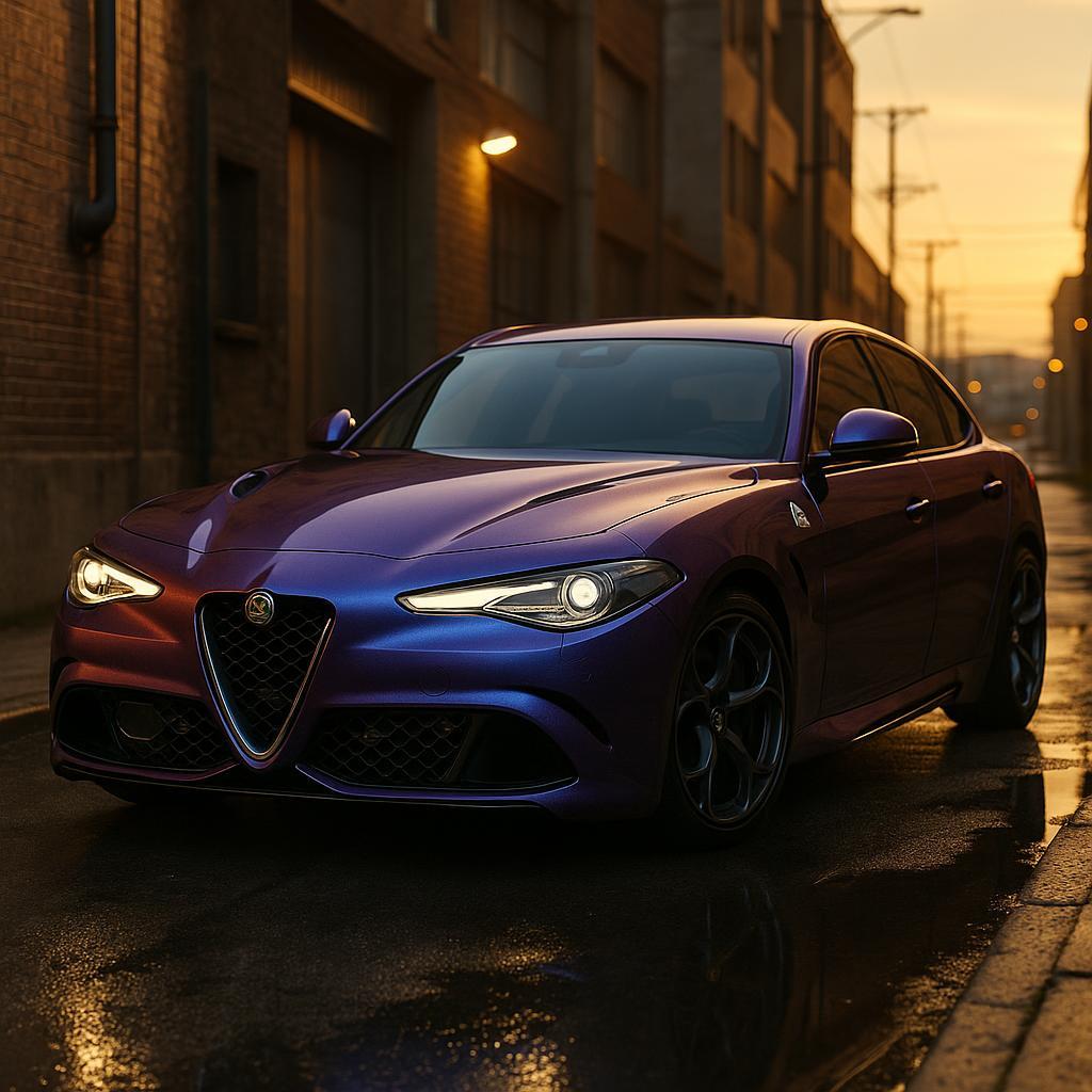 Dominant color: Deep purple with subtle blue and violet undertones. In direct and diffused lighting, reflectivity behavior: Strong reflectivity under hard light, showing a distinct glare strip; softer light reveals a consistent metallic shimmer. Texture/pattern: Fine, uniform metallic flake texture with no visible large-scale patterns.